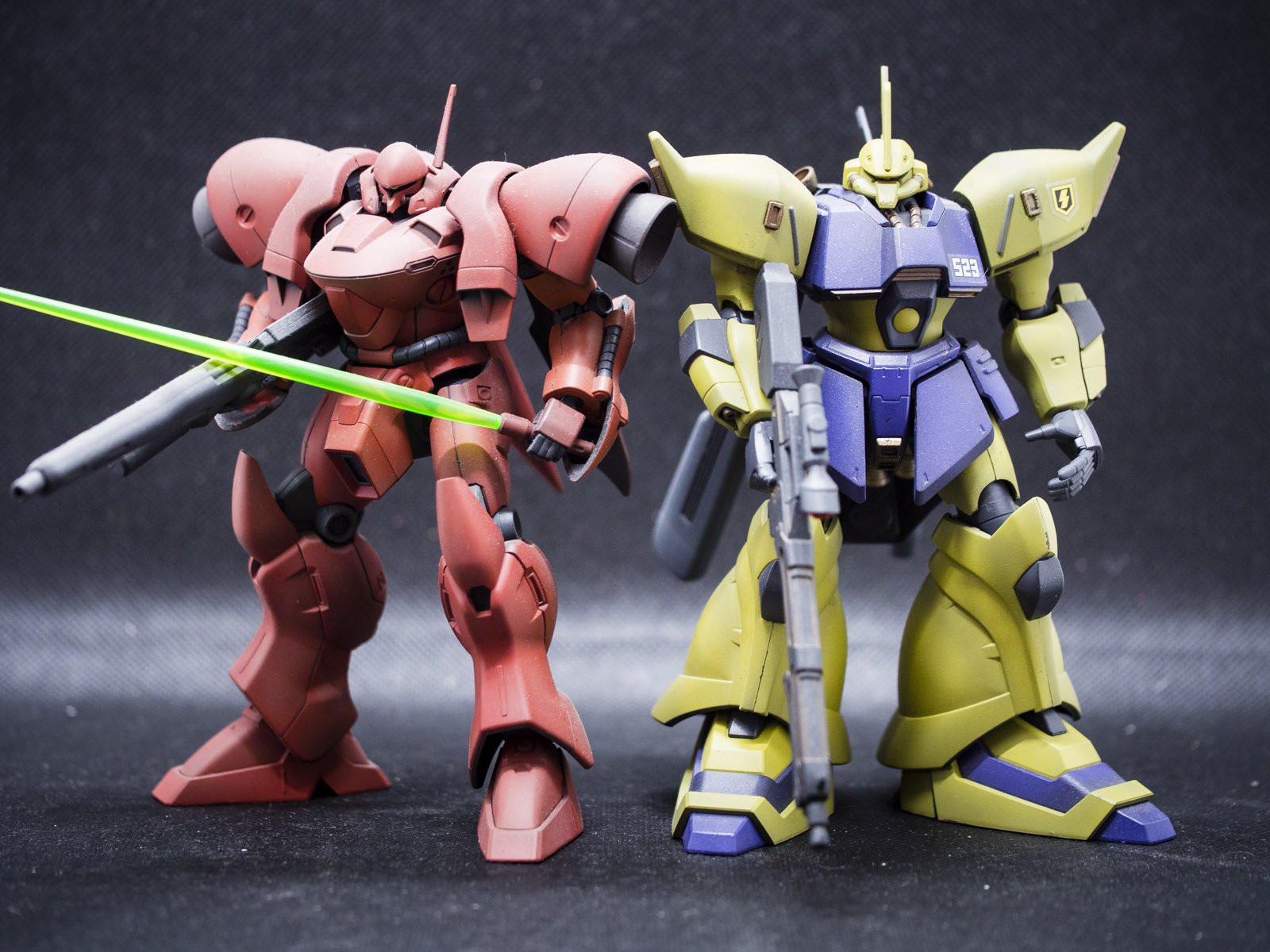 Comparing side-by-side to the standard Gelgoog (which is actually my Cima’s but I repainted to the standard livery); the standard Gelgoog is slightly taller but has a more goofy grunt look on the face comapred to the Jager.