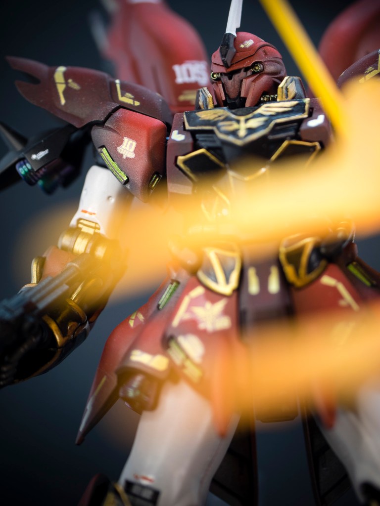 The Sinanju’s boosters were also replaced with large flexible thrusters mounted in a wing-like arrangement on its back. Sporting multiple vernier thrusters throughout its frame, the unit is capable of achieving precise movements and high speeds, which is also like a modernised version of the ‘Red Comet’ “clone”.