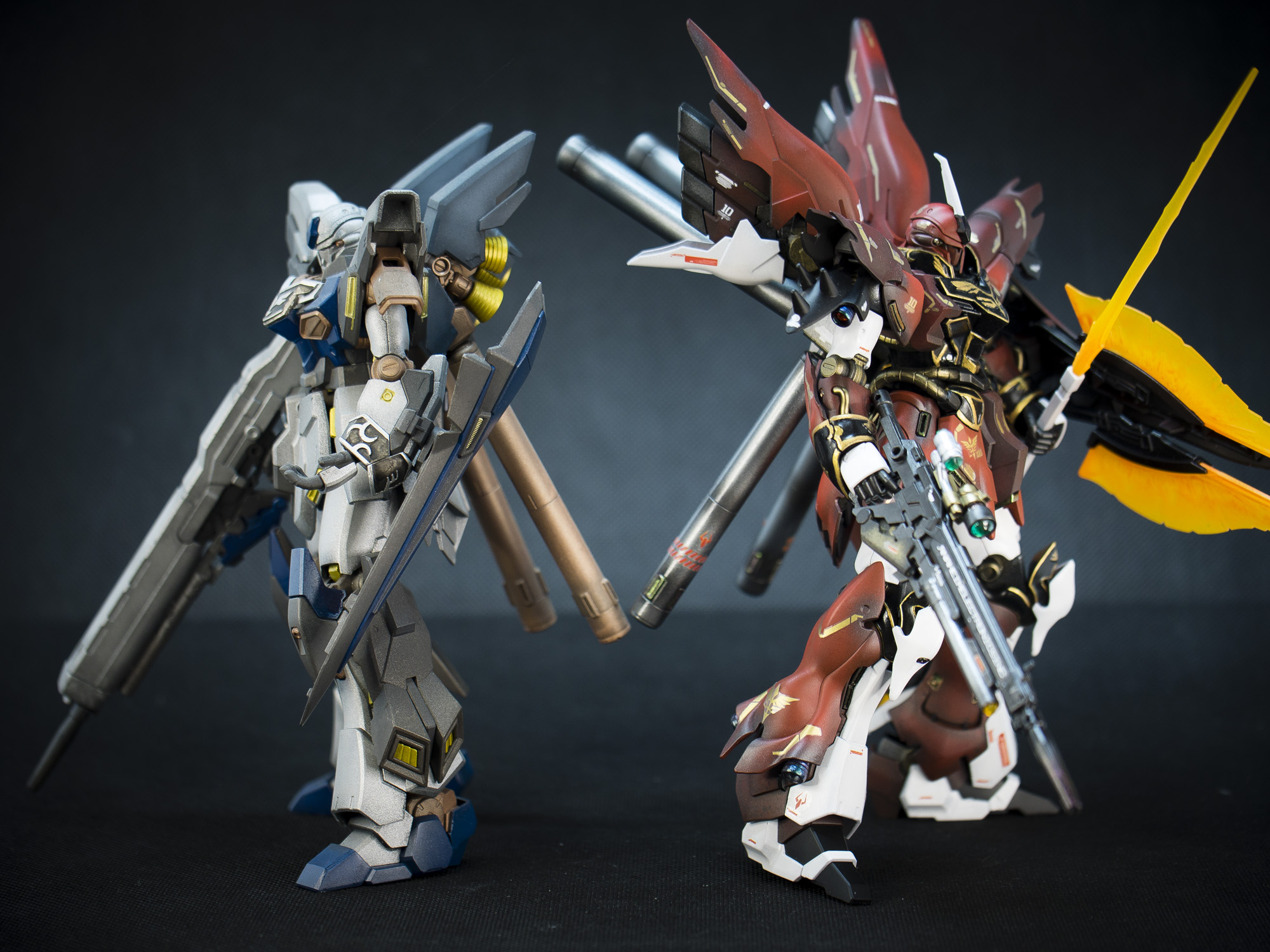 The Sinanju Stein has Gundam-like but modelled such that it has reminiscent of the MSN-04 Sazabi. Below is a side-by-side comparison to Jesta; which although is from the Unicorn era, it still looks slightly small when standing next to the Sinanju.