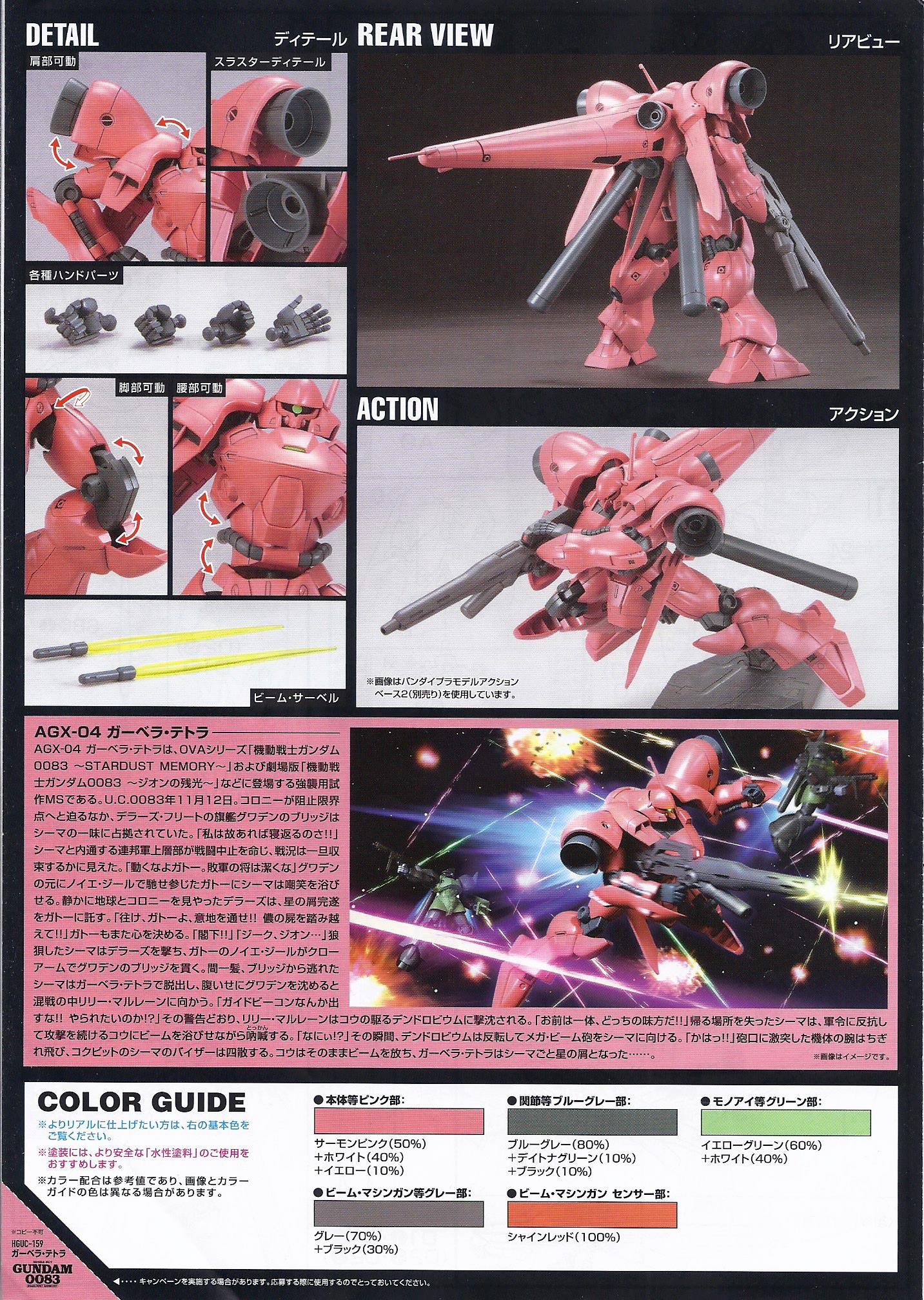 The articulation around the shoulder is poor due to the exhaust fins and huge should thrusters; but who need to move your arms when you have a beam machine gun and rapid movement due to the “GP04” frame inside (mind you there is no inner frame, this is only HG).