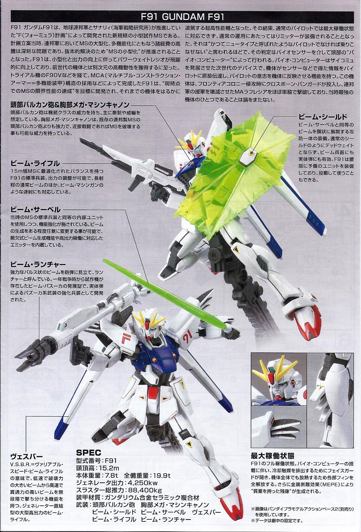 I am always interested in the F91 Gundam because of its heavy engineered design and exposed internals such as the huge heat sink, and heat fins and the beam shield.