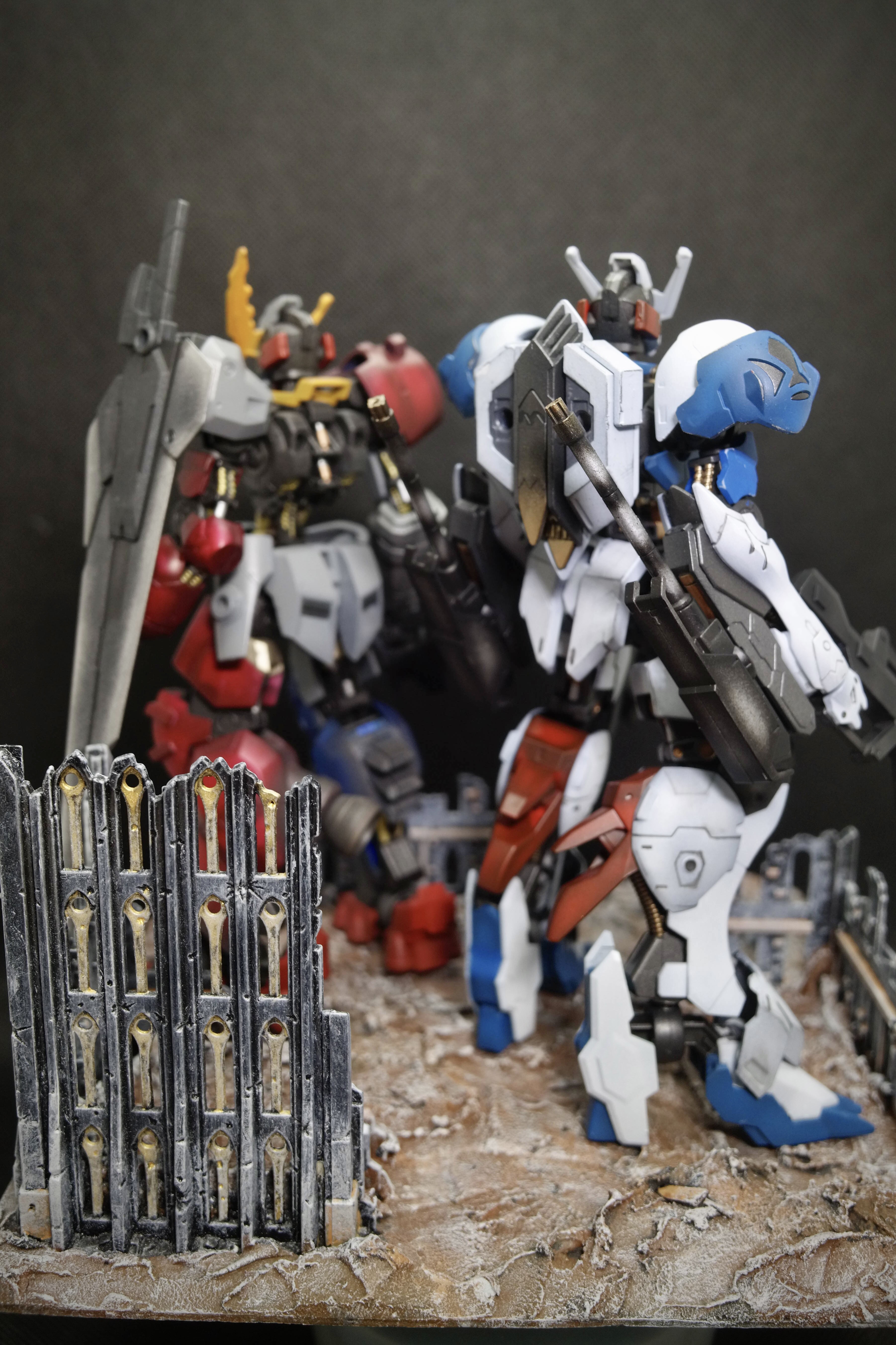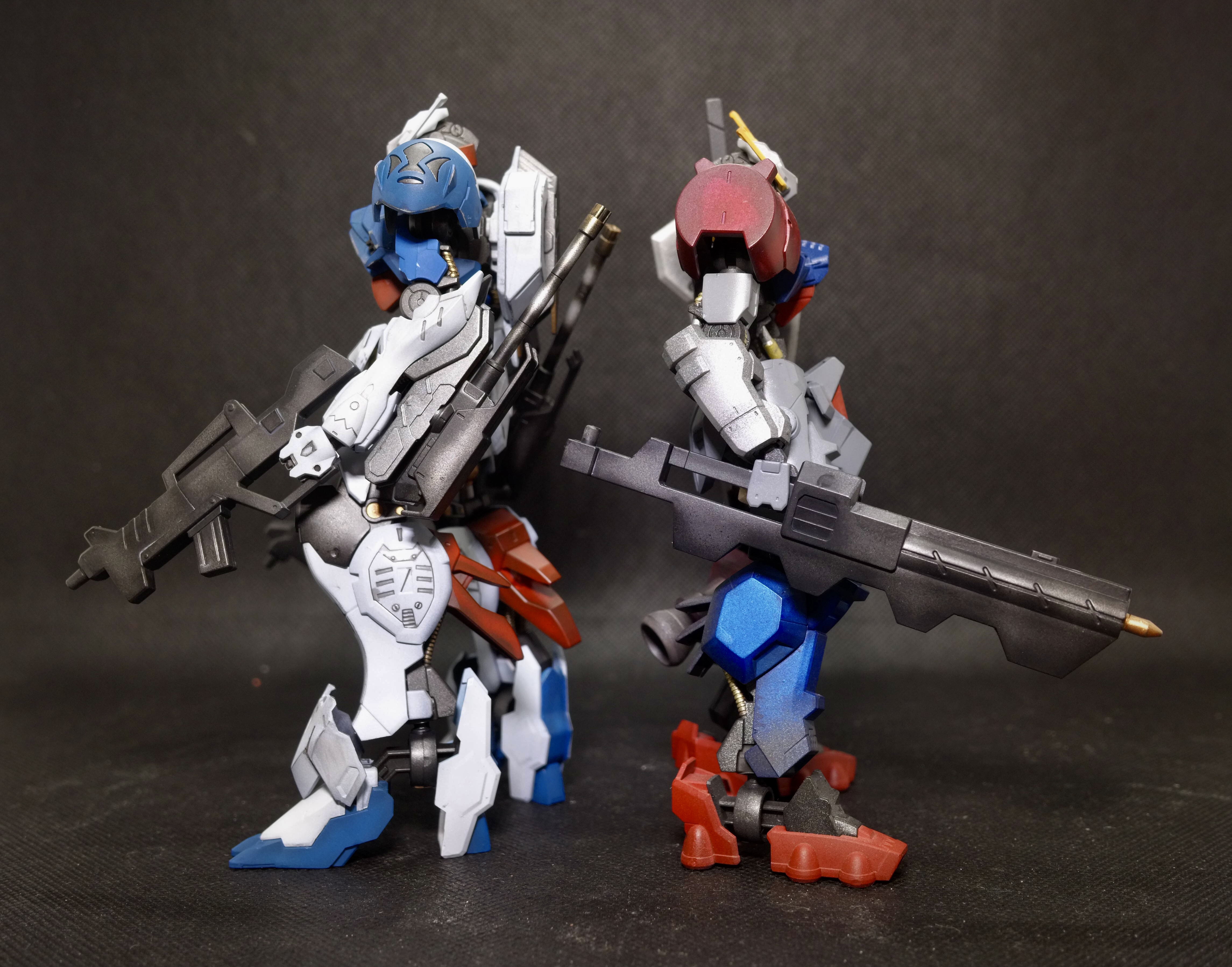 One of the reason for inspiring to go towards a goodie, is because every good police tends to have a “gangster” bad brother (I watched too many HK Police movies growing up). So since I have customised my 1st Astaroth Rinascimento as a asymmetrical junkyard thrown together mobile suit I thought this is a plausible backstory. The akimbo is also a tribute to Chow Yun-Fat double gunning in old HK movies.This is just a side-by-side comparison to the Barbatos Lupus which my Astaroth “Akimbo” shared many parts with.