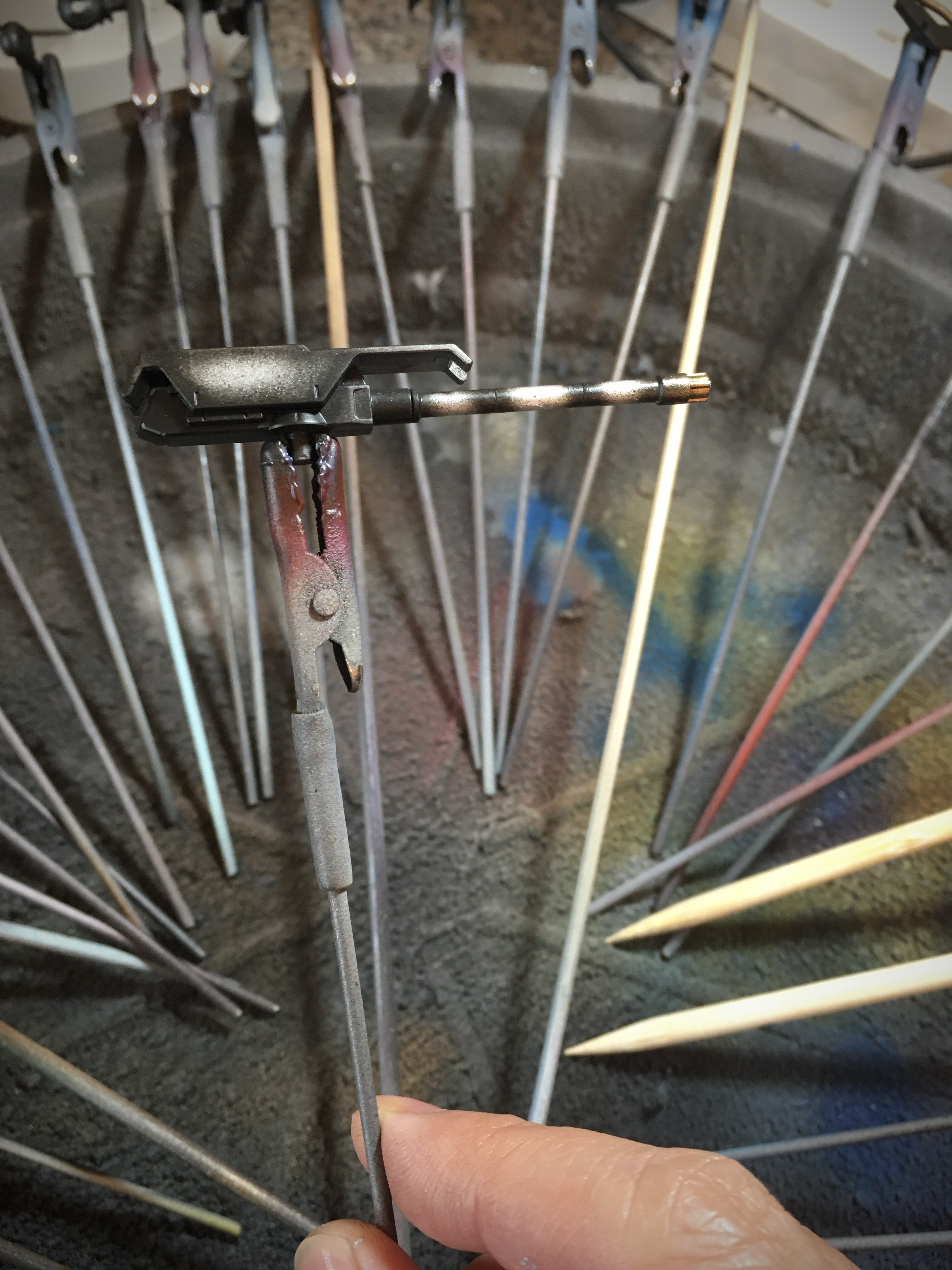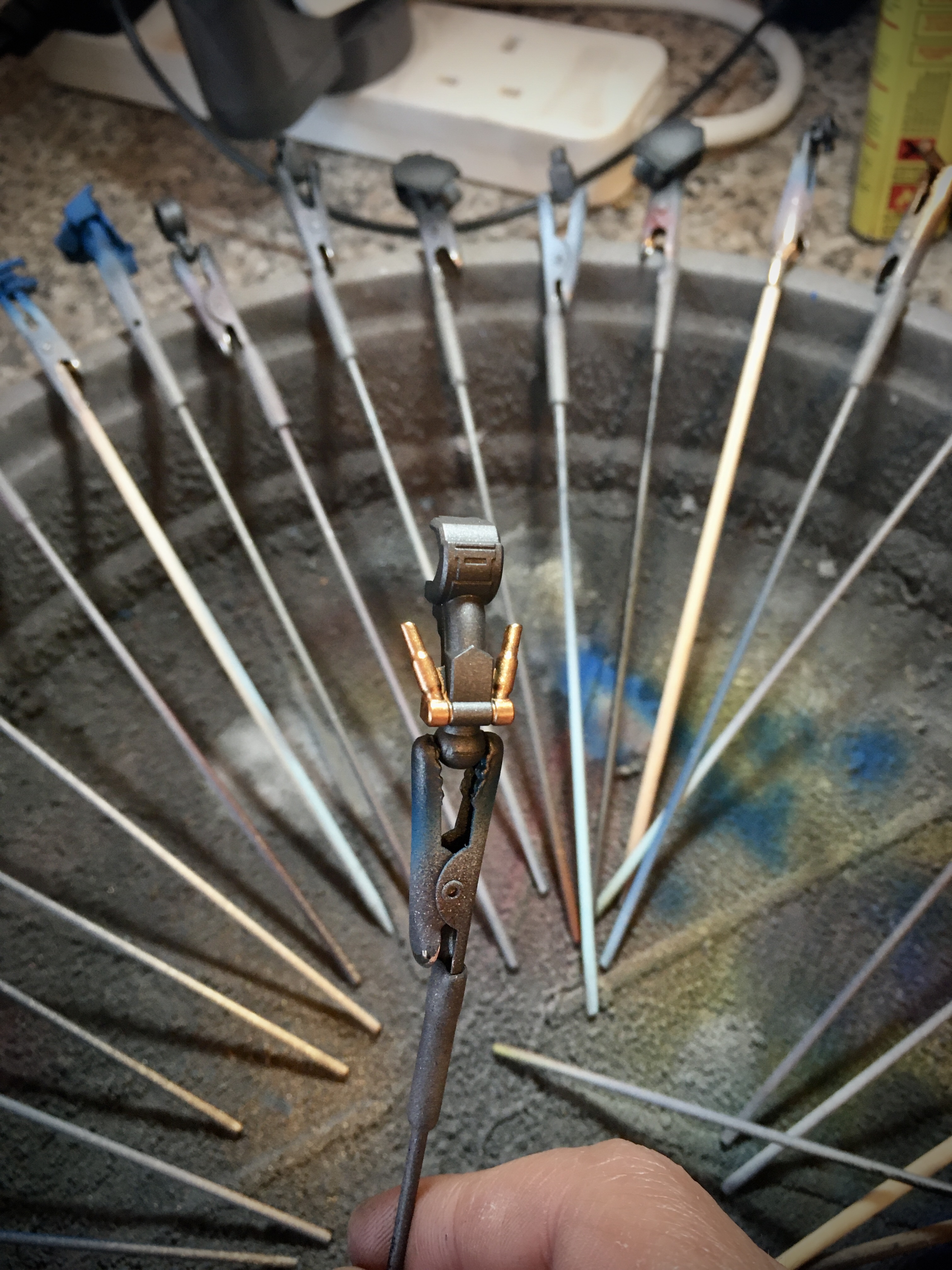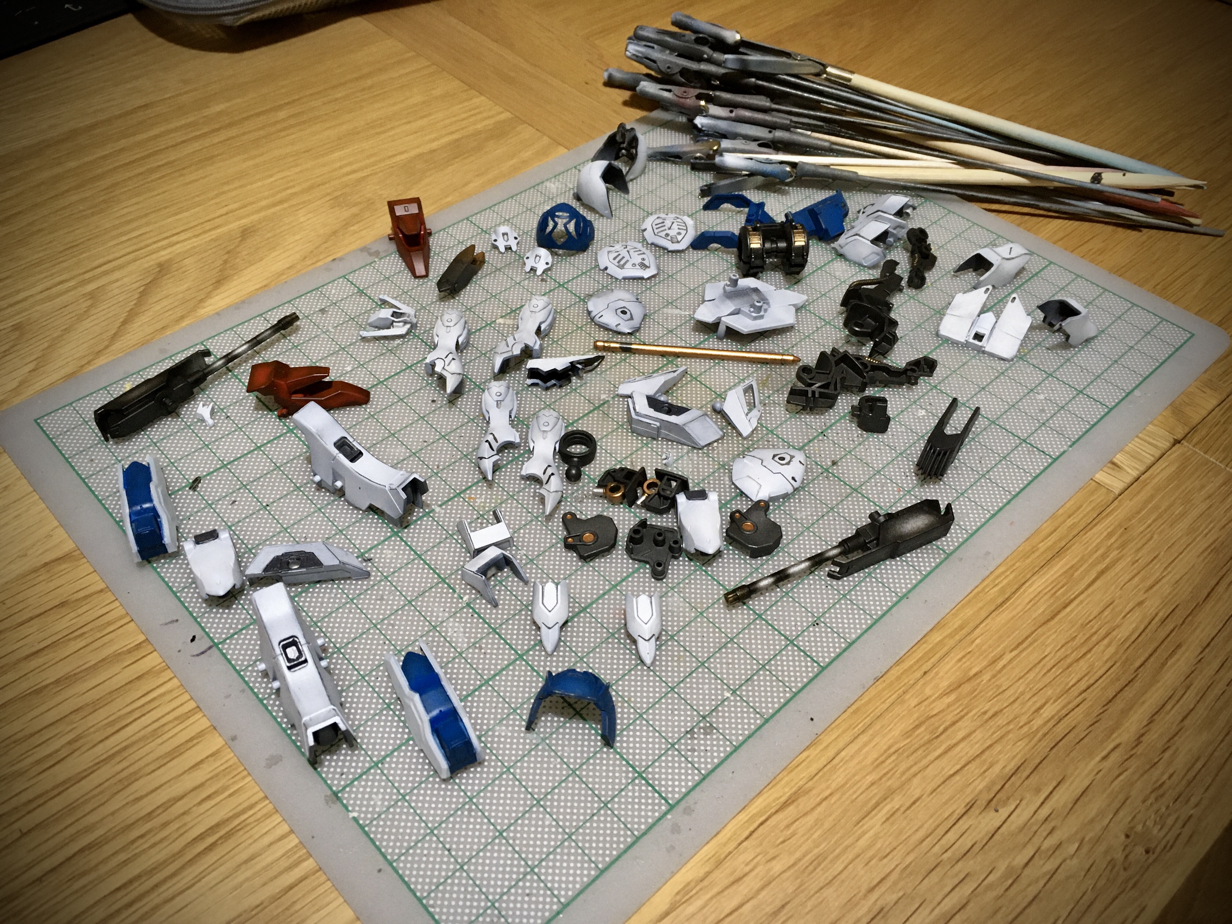 I tend to prime my kit with Tamiya Flat colours, I usually use a slightly thicker mixture just to give a strong coat and finish with a gloss black as pre-shade. I use mainly Vallejo Air as a base colours because they comes pre-thinned for airbrush and it is an easier way to control the amount of shade you like to show by adding multiple coats of base colour. The mecha bits of the IBO inner frame are typically hand painted with metallic colours, I tend to use Vallejo Model colours for the strong colours.