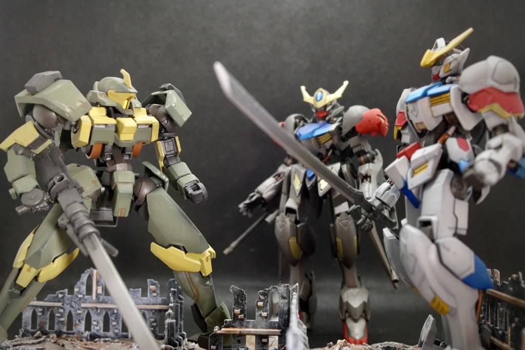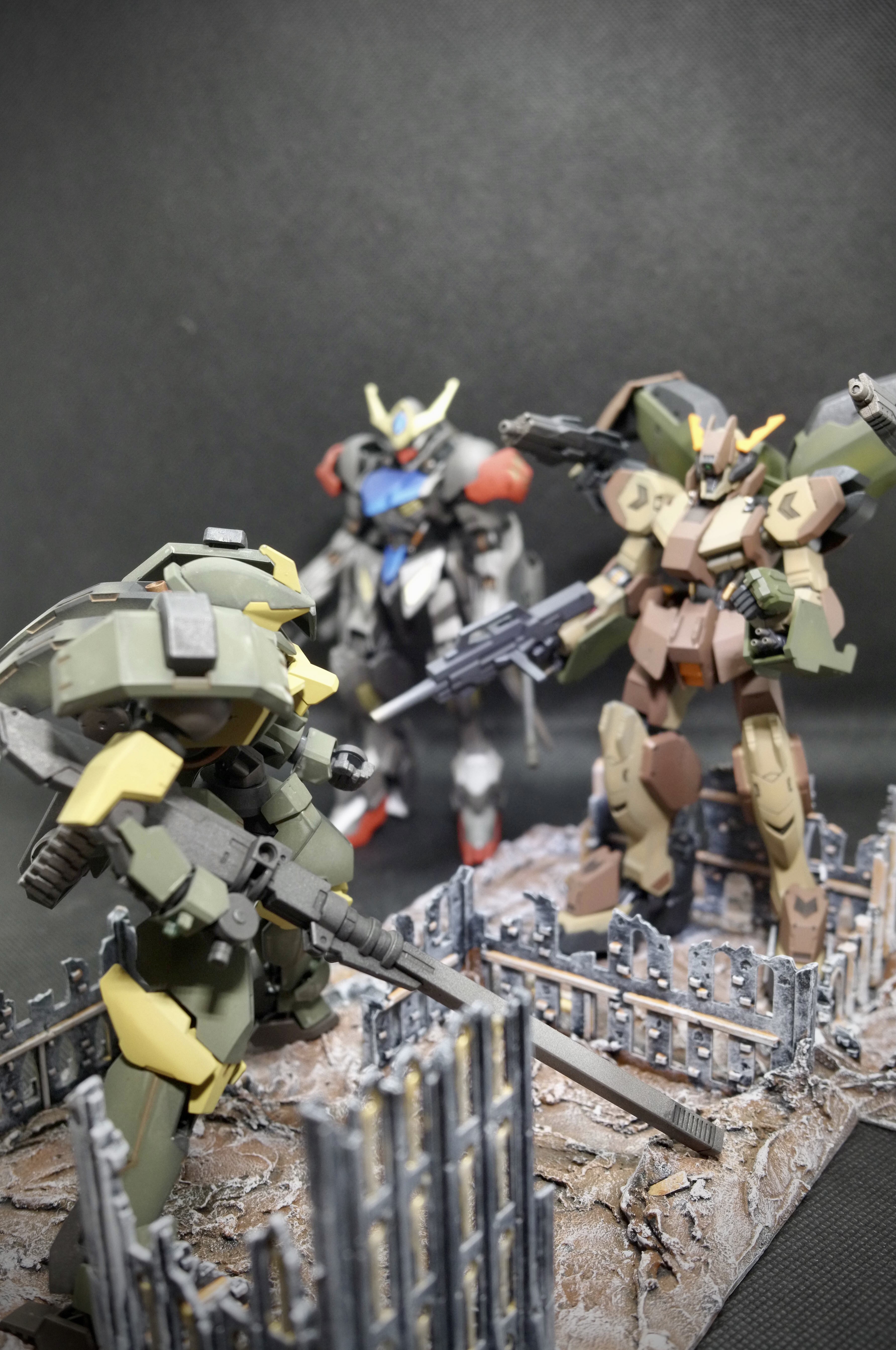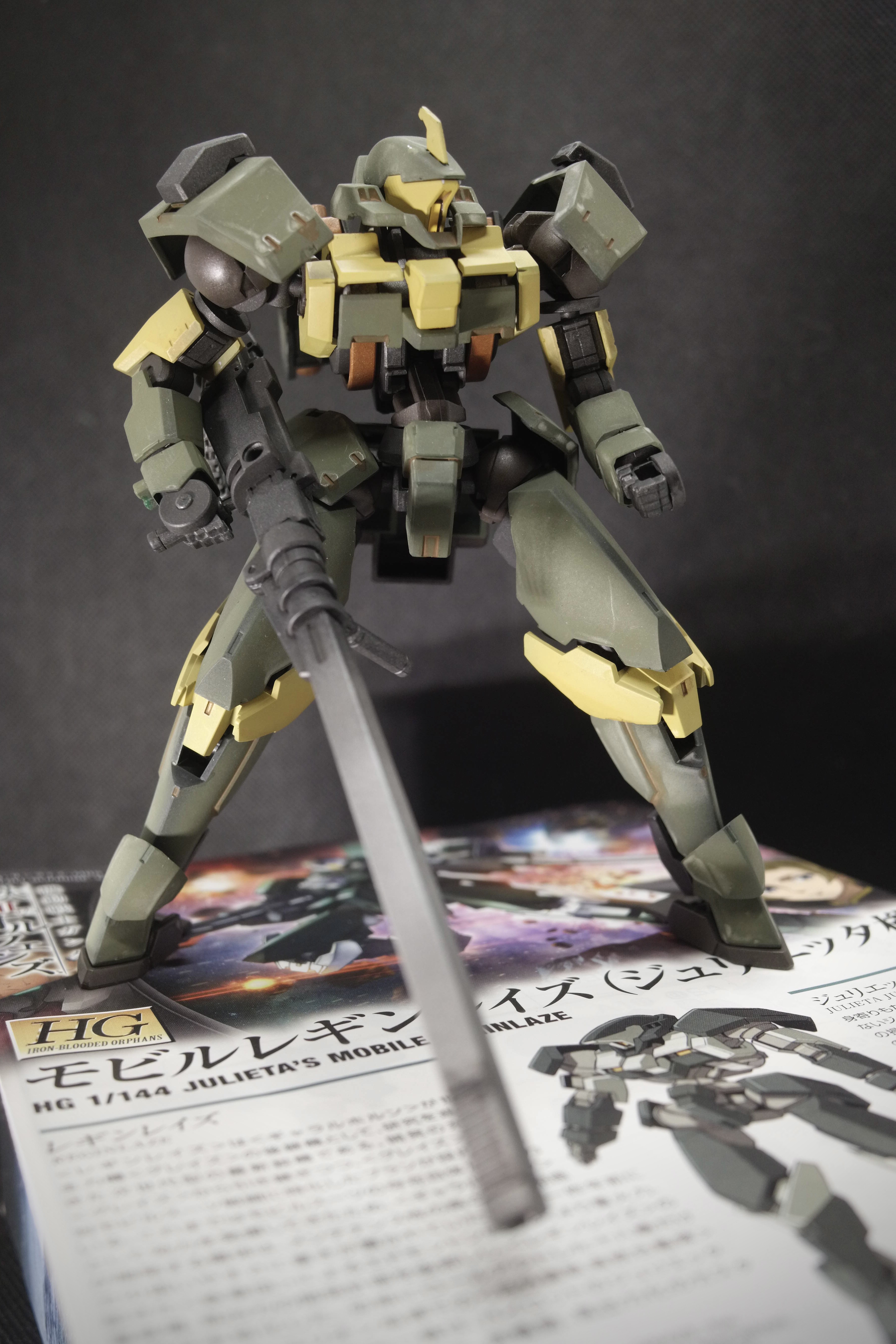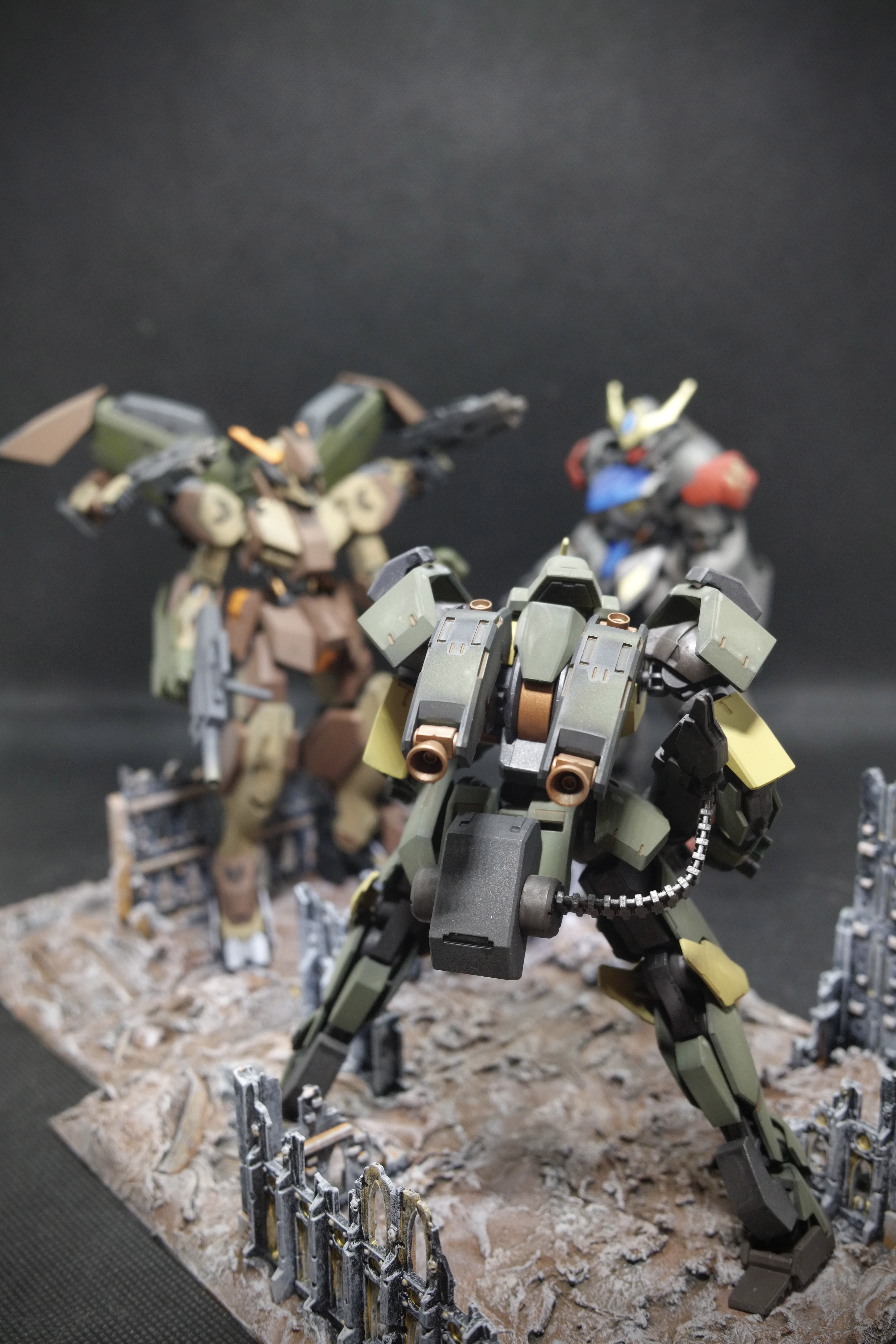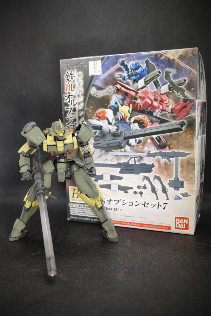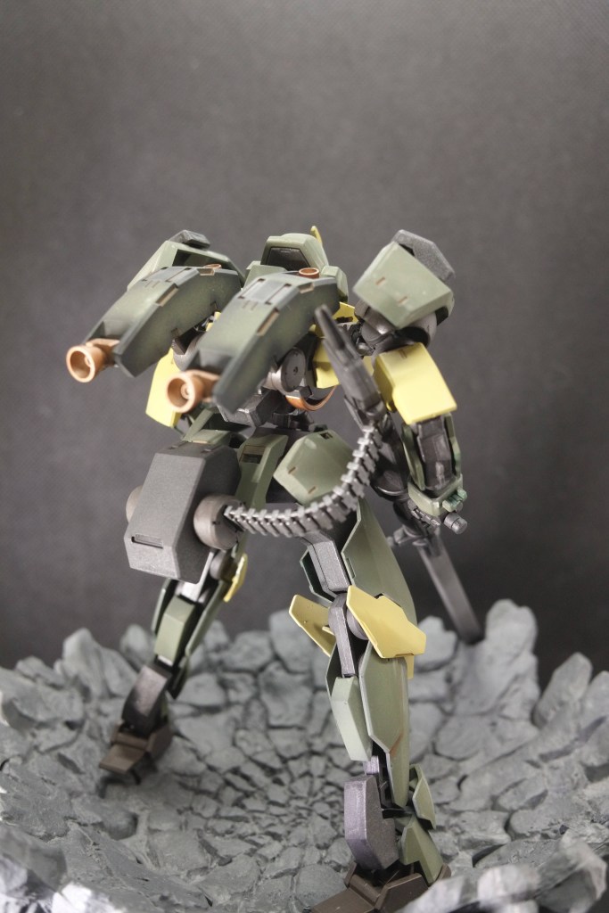 One big mistake I made during painting is that I used Matt Varnish directly without thinning it down. This left a very matt finish with white streaks. It is not the end of the world and I kind of resigned to the fact that it does helps with the weathered look (but deep down I knew I made a mistake). The other disappointment on this kit it that the ball joints are so loose; especially the hip joints. I tried using dry paint method, and it did work for a while, but after a few poses, the legs starts to spread under it own weight. The long barrel does comes in handy as a “stand” (maybe that is what Bandai have in mind all this time)!Weapon Option Set 7 is quite a good pack, there are lots of useful accessories, I used the Vidar’s open hand on my Schwalbe Graze. The back and giant cannons are used in another kit bash. With regards to the loose hip joints, this pose with legs apart is “natural”, the legs are moving apart just so slightly during the photoshoot.