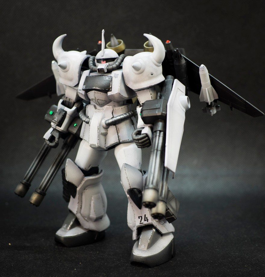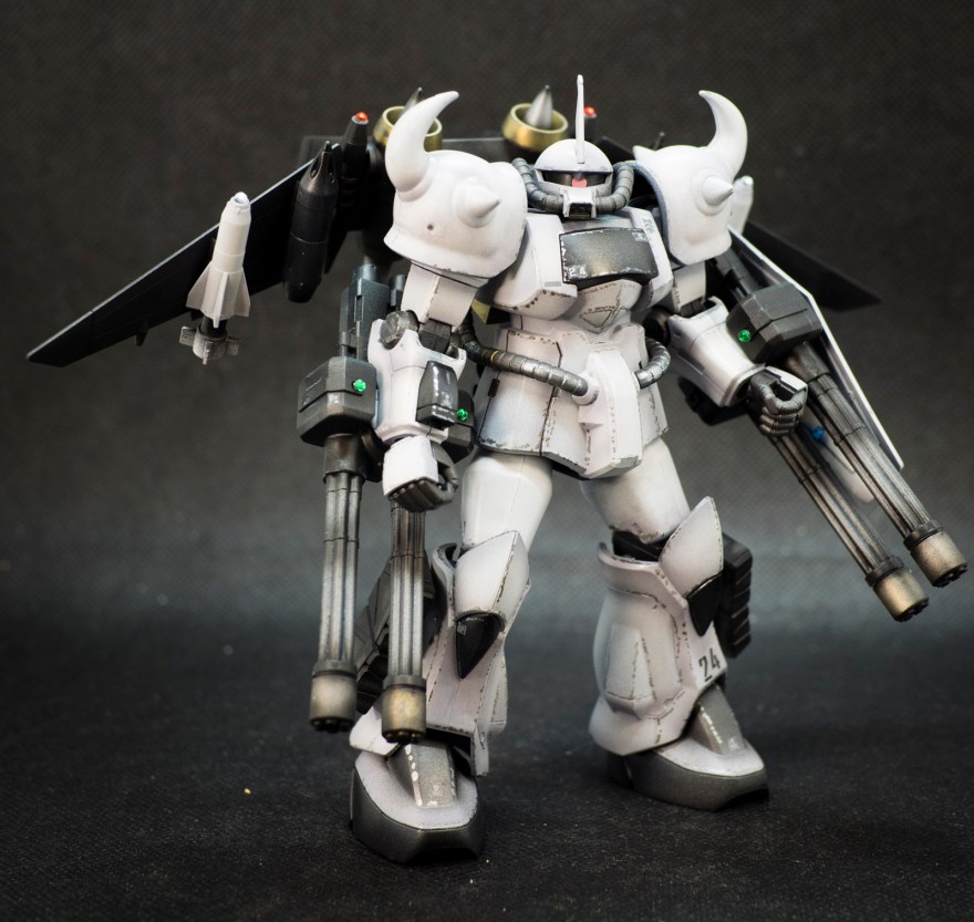 I am never interested in the Gouf mainly because I don’t like the huge curved horn design, I just don’t see it been a practical mobie suit design. But that is not the main reason why it is in my list of least favourite. The reason why it is here is because I was disappointed in myself for failing to get the pre-shading for the white to show up properly. I have no choice but to use weathering to break out the total snow white effect. This is the only kit that I might dump into the “Box of Despair”and buy another to do it again. Have I said that I really dislike painting “white”?