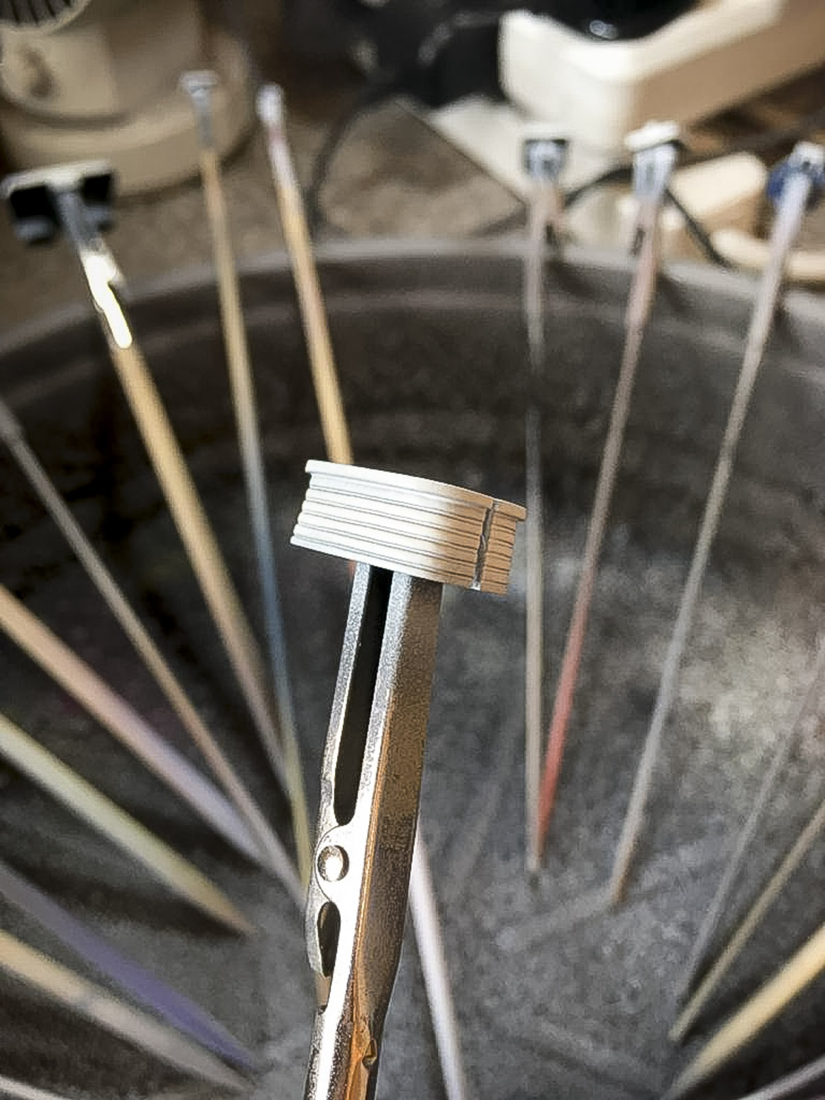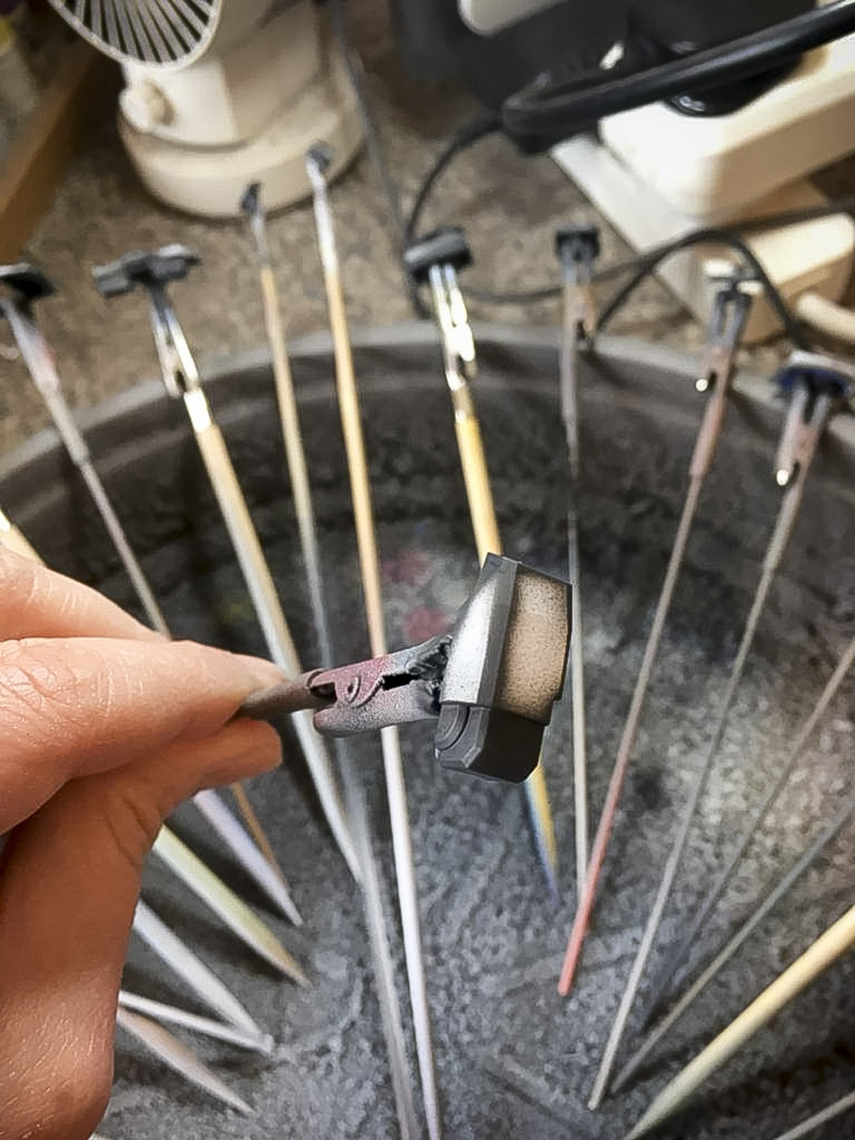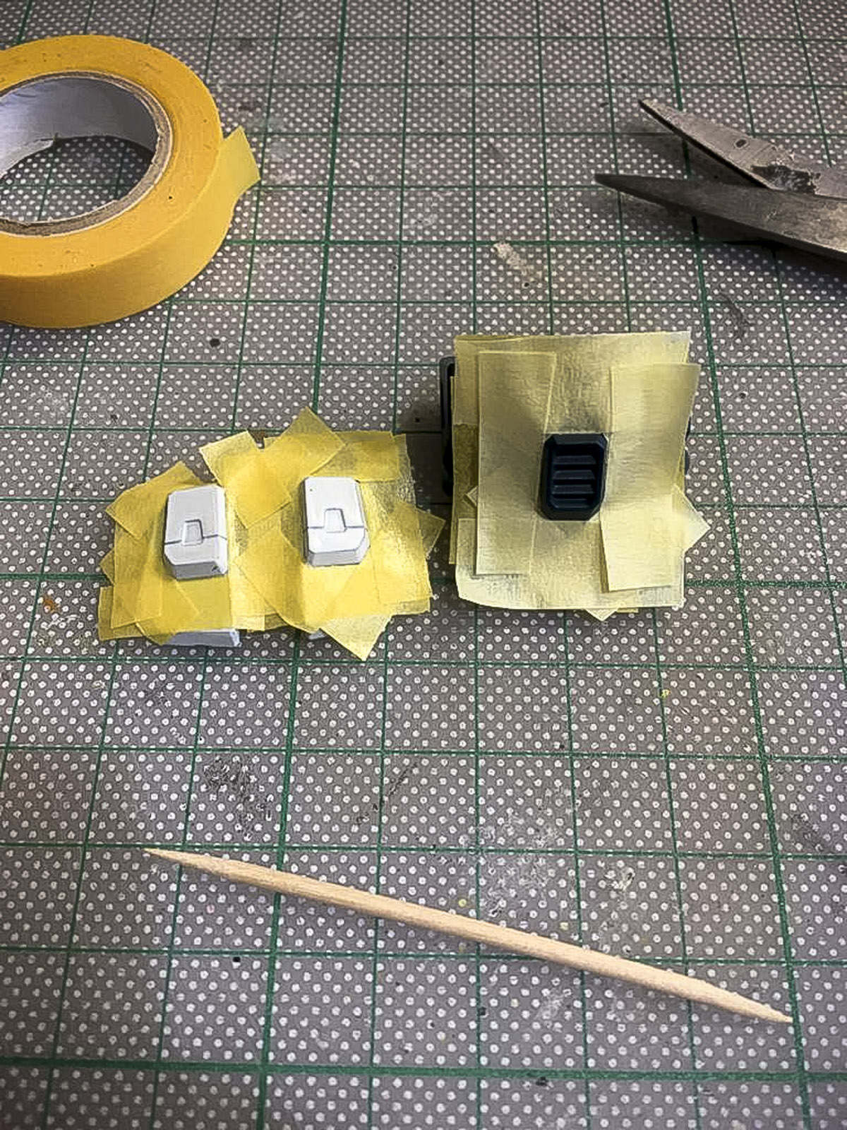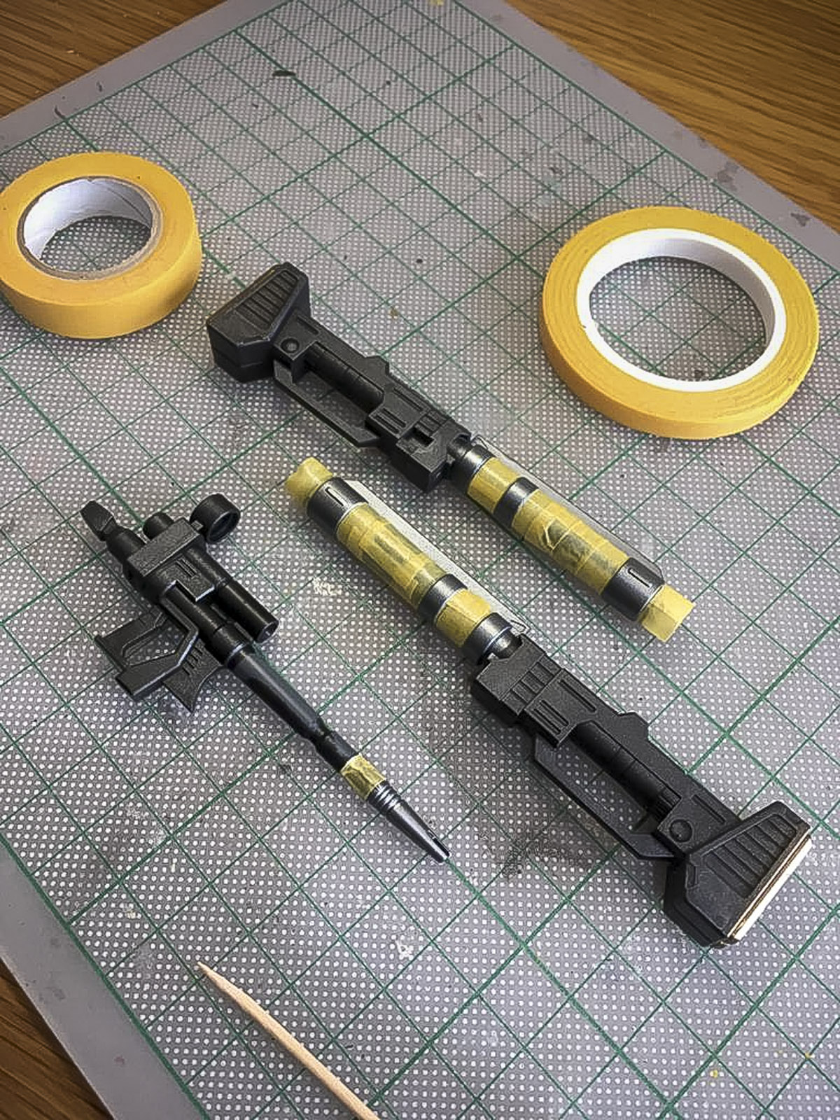 I love painting the thruster bells, I tend to use double sided tape and give it a black coat to help bring out the shine on the silver layer. The silver is to give a metallic shine to the red inside of the thruster bells. Once dried, reversed the thruster bells are sprayed the outside; this will give a nice interesting contrast to the thruster bells and help make it stand out.