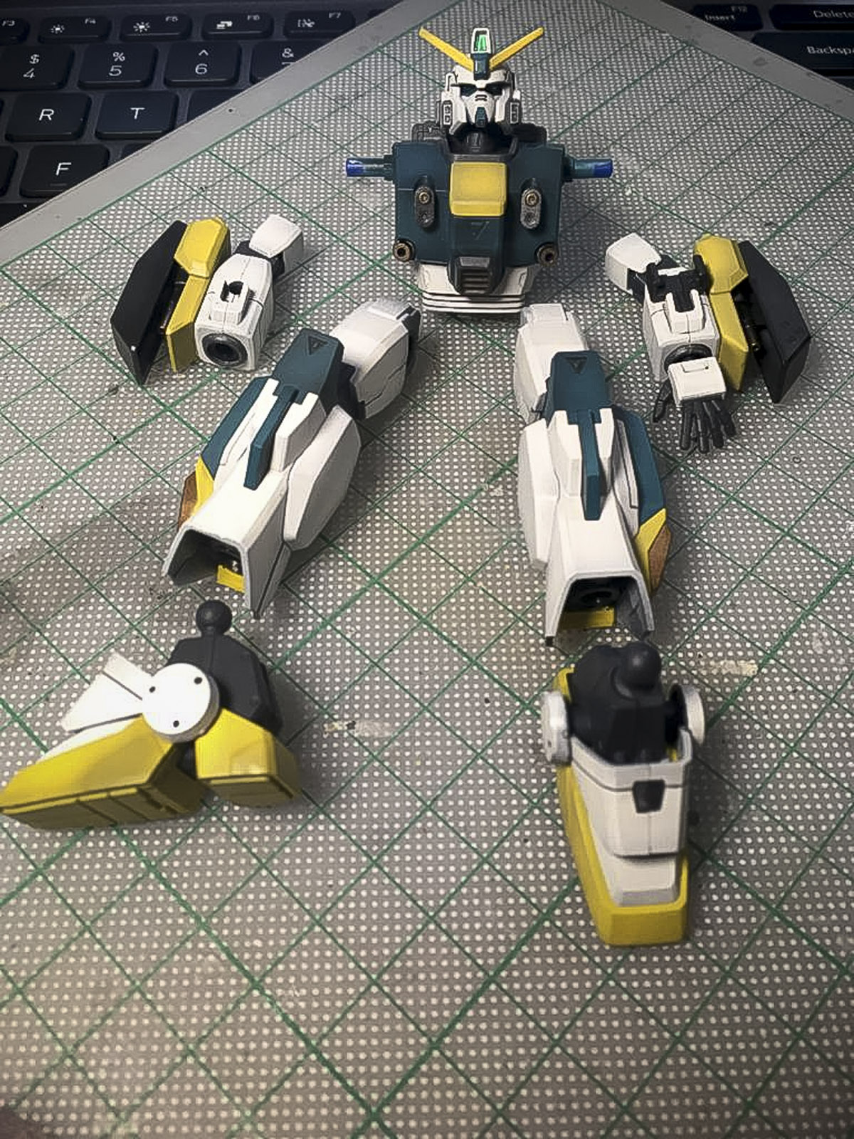 I am not keen on making another Blue Destiny kit, and I was inspired by the latest PBandai Mudrock. The Mudrock is the 6 variant of the RX-78 design; it is modified to improve on the original design by giving it more long range fire power. I thought the Blue Destiny unit is a good start because the chest itself is already equipped with several ballistic weapons. Thus, my kitbash included a head unit from a Ground Gundam, Beam Cannons from Ground Gundams, Heavy Beam Rifle from Gun Cannon, Heavy Shield from Alex NT-1, and Hand Gatling Pods from Powered Arms Powereder Weapons Pack from Build Divers.