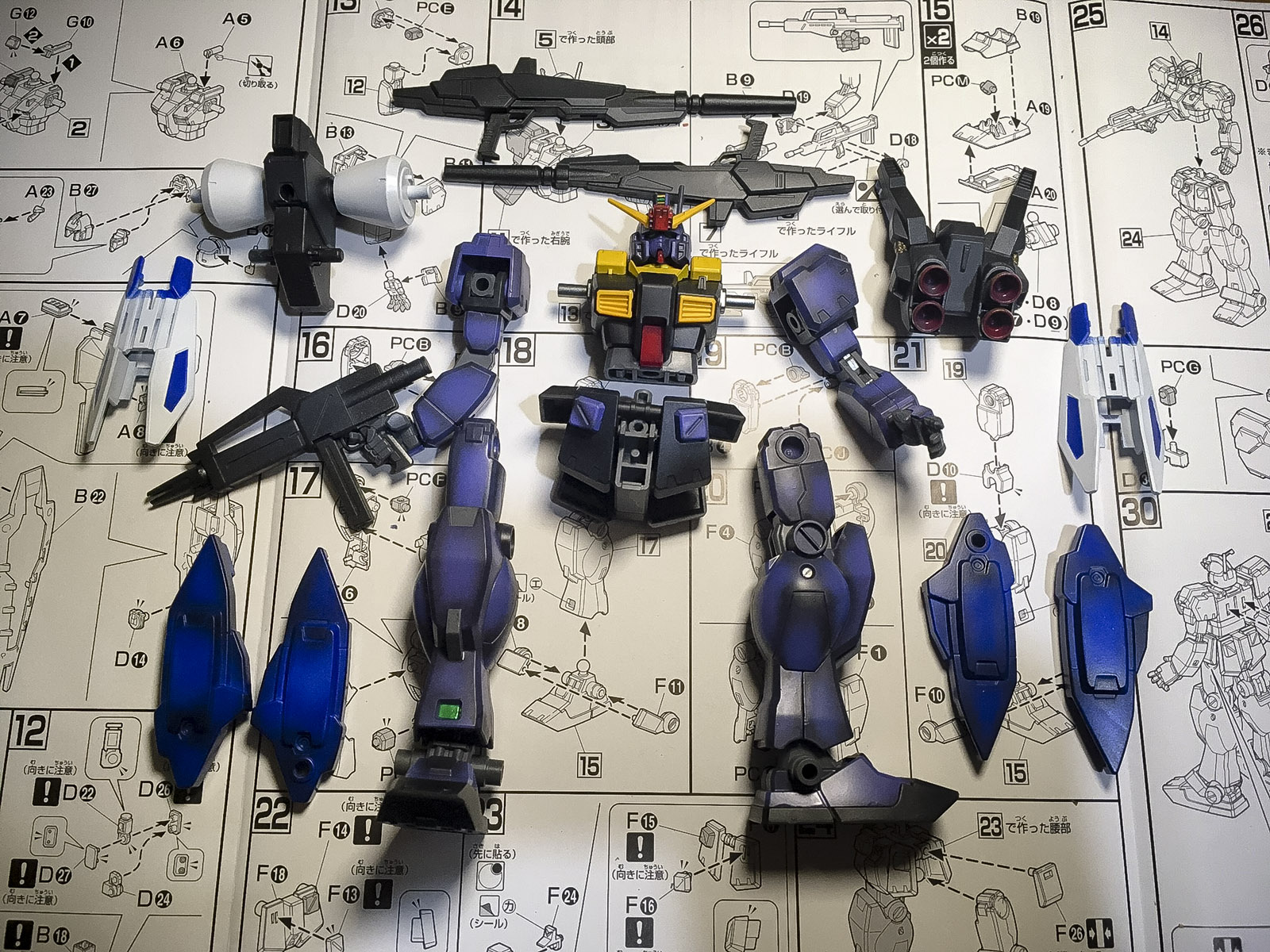I am not keen on making another Blue Destiny kit, and I was inspired by the latest PBandai Mudrock. The Mudrock is the 6 variant of the RX-78 design; it is modified to improve on the original design by giving it more long range fire power. I thought the Blue Destiny unit is a good start because the chest itself is already equipped with several ballistic weapons. Thus, my kitbash included a head unit from a Ground Gundam, Beam Cannons from Ground Gundams, Heavy Beam Rifle from Gun Cannon, Heavy Shield from Alex NT-1, and Hand Gatling Pods from Powered Arms Powereder Weapons Pack from Build Divers.