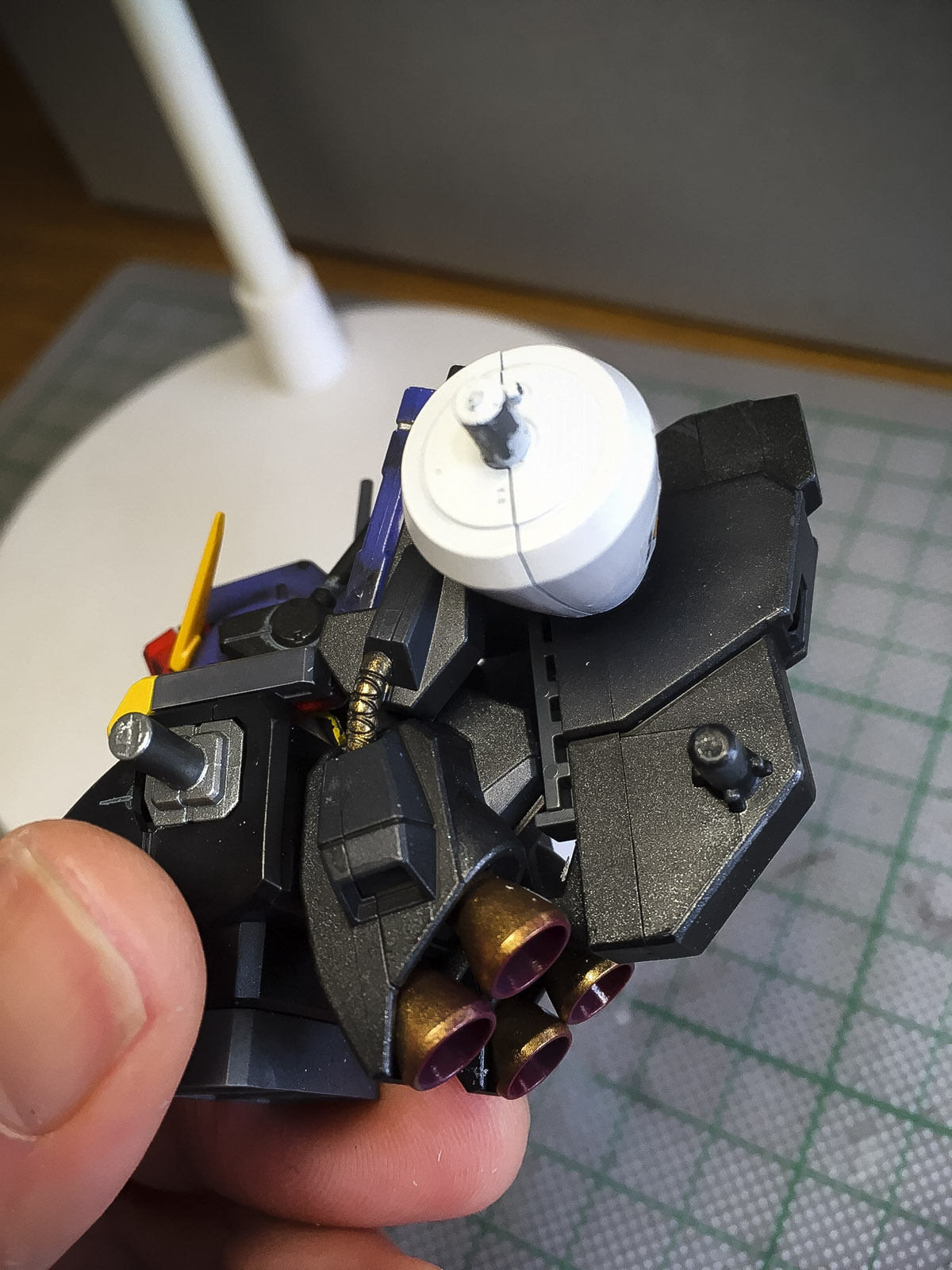 I am also inspired after watching Build Fighters anime where they used a modified Gundam Mk2 with a G-Defensor booster! It was quite difficult to get my hands on the Build Fighter Mk2 and I am not really keen on the head and chest design hence I thought this Hazel 2 will look great when customised with a Booster backpack instead. I also kit-bash my Hazel with GM3 backpack, head vulcan and beam machine gun from Jegan, Side skirt armour from GM Command. In order to get the booster to retro-fit securely to the GM3 backpack, I have to drill a 2mm hole to accept the peg from the booster; I could used super glue as well but I thought a hole and peg will give me more options in the future.
